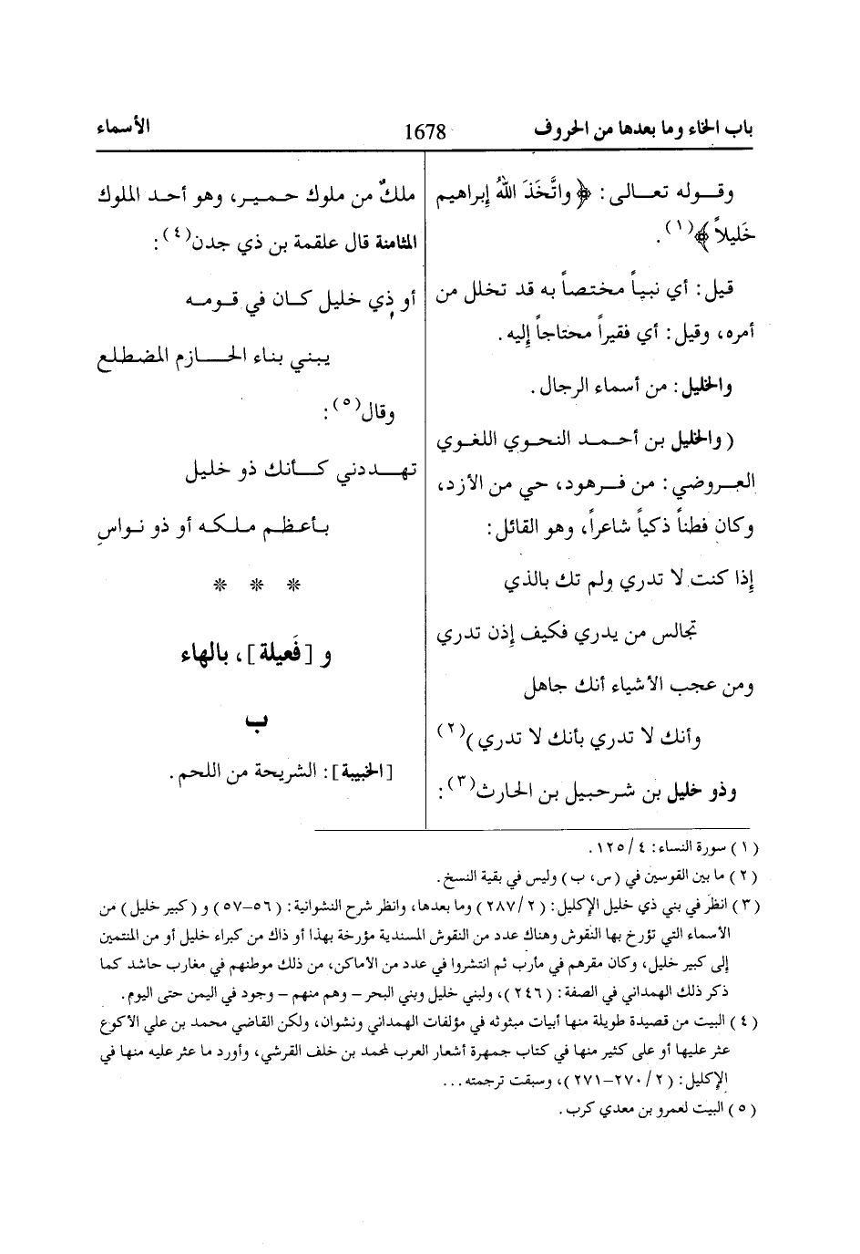 (3) انظر في بني ذي خليل الإِكليل: (2/ 287) وما بعدها، وانظر شرح النشوانية: (56 - 57) و (كبير خليل) من الأسماء التي تؤرخ بها النقوش وهناك عدد من النقوش المسندية مؤرخة بهذا أو ذاك من كبراء خليل أو من المنتمين إِلى كبير خليل، وكان مقرهم في مأرب ثم انتشروا في عدد من الأماكن، من ذلك موطنهم في مغارب حاشد كما ذكر ذلك الهمداني في الصفة: (246)، ولبني خليل وبني البحر- وهم منهم- وجود في اليمن حتى اليوم.