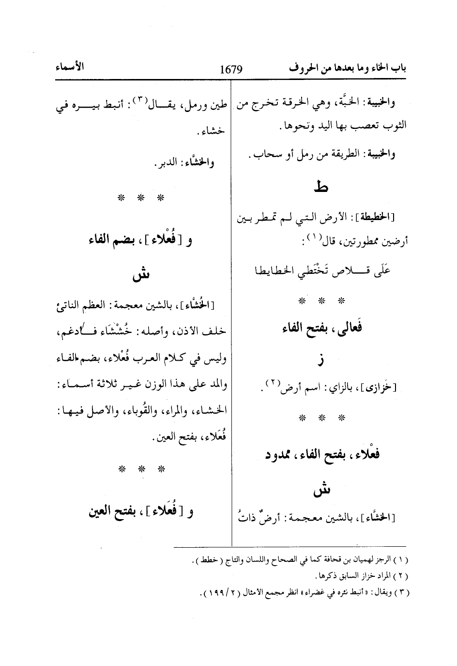 [الخُشَّاء]، بالشين معجمة: العظم الناتئ خلف الأذن، وأصله: خُشْشَاء فأدغم، وليس في كلام العرب فُعْلاء، بضم الفاء والمد على هذا الوزن غير ثلاثة أسماء: