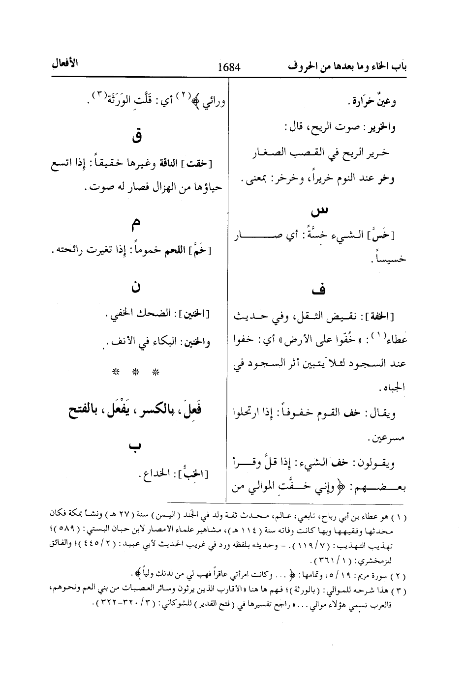 ويقولون: خف الشيء: إِذا قلَّ وقرأ بعضهم: وإني خَفَّتِ الموالي من ورائي «2» أي: قَلَّتِ الوَرَثَة «3».