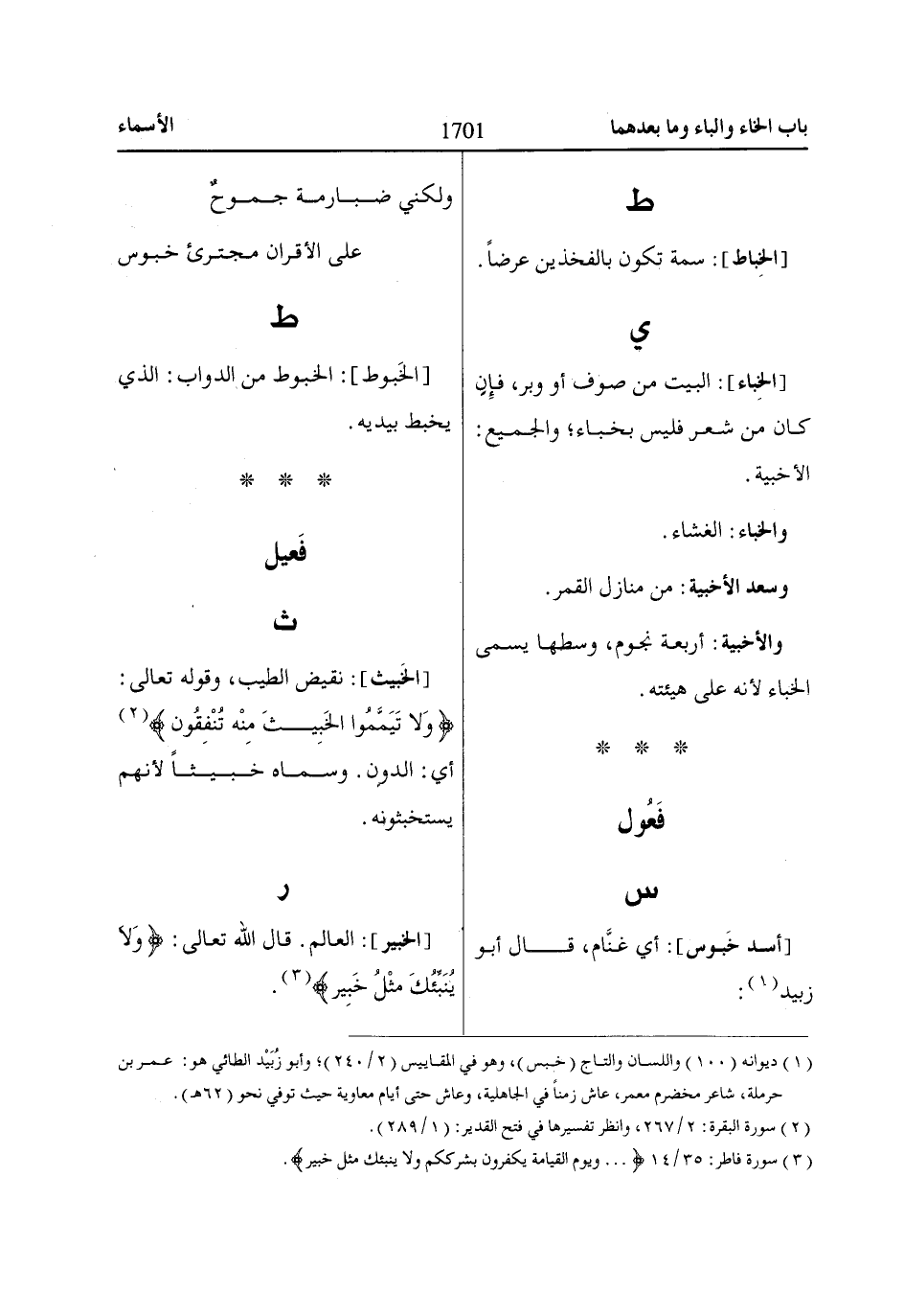 (1) ديوانه (100) واللسان والتاج (خبس)، وهو في المقاييس (2/ 240)؛ وأبو زُبَيْد الطائي هو: عمر بن حرملة، شاعر مخضرم معمر، عاش زمناً في الجاهلية، وعاش حتى أيام معاوية حيث توفي نحو (62 هـ).