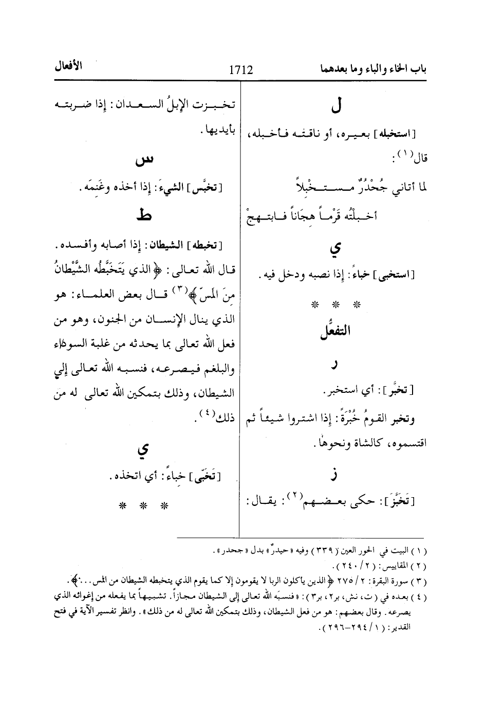 قال الله تعالى: الَّذِي يَتَخَبَّطُهُ الشَّيْطاانُ مِنَ الْمَسِّ «3» قال بعض العلماء: هو الذي ينال الإِنسان من الجنون، وهو من فعل الله تعالى بما يحدثه من غلبة السوداء والبلغم فيصرعه، فنسبه الله تعالى إِلى الشيطان، وذلك بتمكين الله تعالى له من ذلك «4».