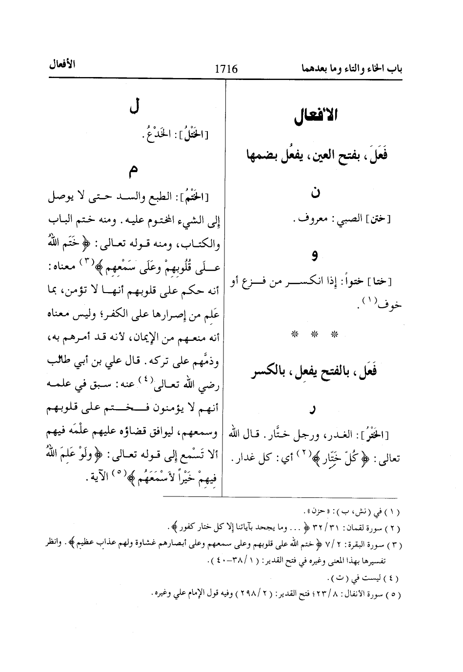 (3) سورة البقرة: 2/ 7 خَتَمَ اللّاهُ عَلى قُلُوبِهِمْ وَعَلى سَمْعِهِمْ وَعَلى أَبْصاارِهِمْ غِشااوَةٌ وَلَهُمْ عَذاابٌ عَظِيمٌ. وانظر تفسيرها بهذا المعنى وغيره في فتح القدير: (1/ 38 - 40).
