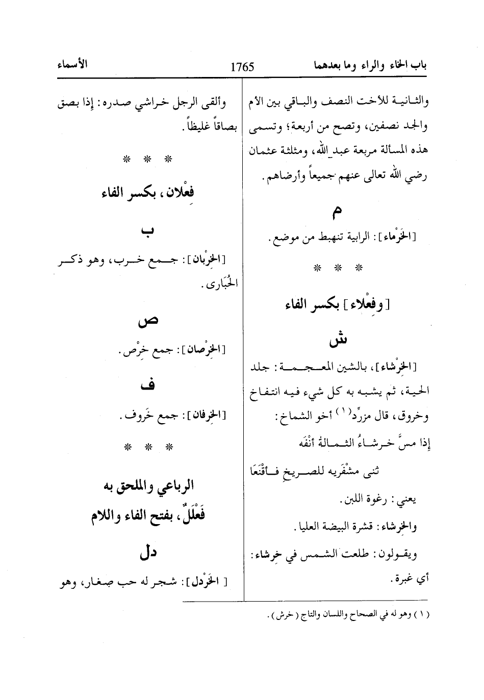 [الخِرْشاء]، بالشين المعجمة: جلد الحية، ثم يشبه به كل شيء فيه انتفاخ وخروق، قال مزرِّد «1» أخو الشماخ: