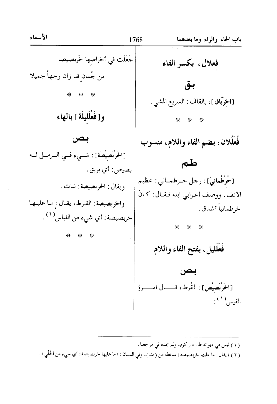 (2) «يقال: ما عليها خربصيصة» ساقطه من (ت)، وفي اللسان: «ما عليها خربصيصة: أي شيء من الحَلْيِ».