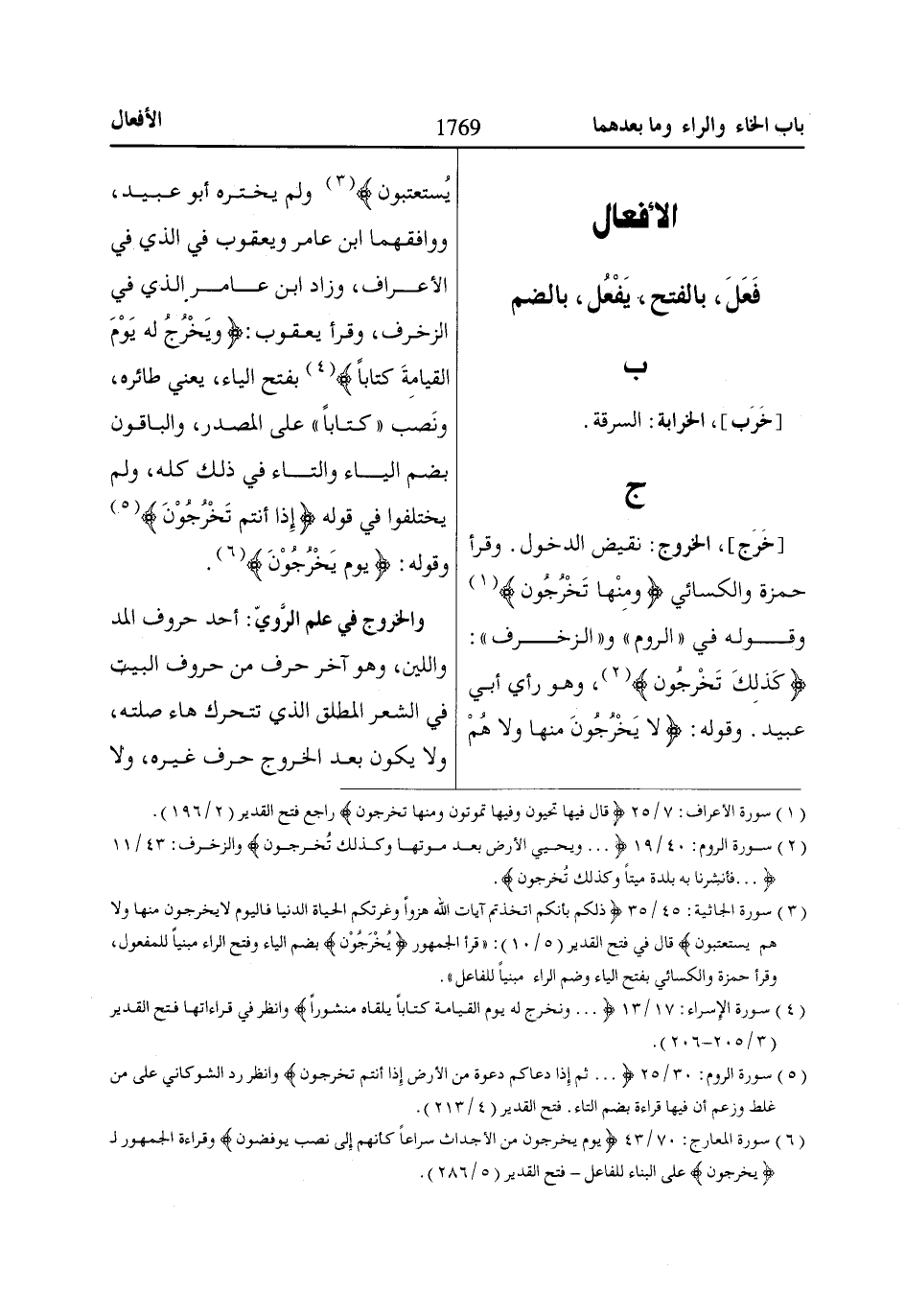 (5) سورة الروم: 30/ 25 ... ثُمَّ إِذاا دَعااكُمْ دَعْوَةً مِنَ الْأَرْضِ إِذاا أَنْتُمْ تَخْرُجُونَ وانظر رد الشوكاني على من غلط وزعم أن فيها قراءة بضم التاء. فتح القدير (4/ 213).