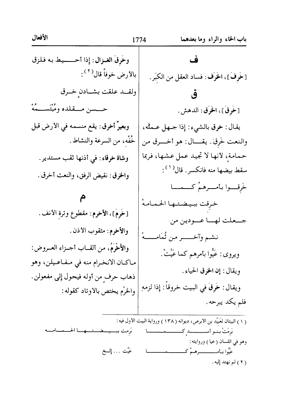 يقال: خرق بالشيء: إِذا جهل عملَه، والنعت خَرِق. يقال: هو أخرق من حمامةٍ، لأنها لا تجيد عمل عشها، فربما سقط بيضها منه فانكسر. قال «1»: