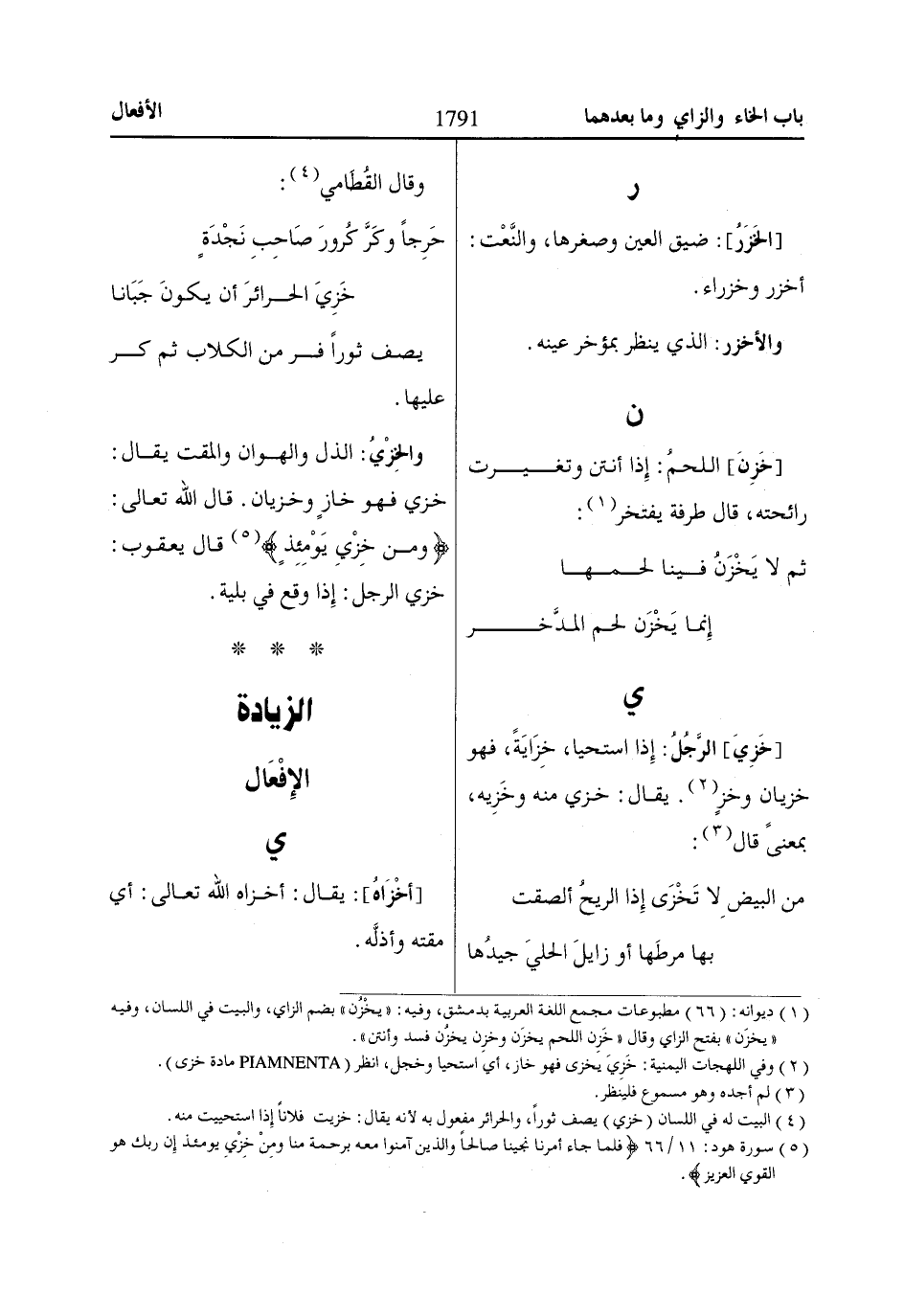 (1) ديوانه: (66) مطبوعات مجمع اللغة العربية بدمشق، وفيه: «يخْزُن» بضم الزاي، والبيت في اللسان، وفيه «يخزَن» بفتح الزاي وقال «خَزِن اللحم يخزَن وخزِن يخزُن فسد وأنتن».