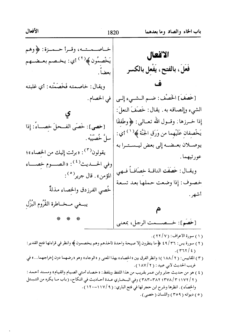[خَصَم]: خصمت الرجل، بمعنى خاصمته، وقرأ حمزة: وَهُمْ يَخِصِّمُونَ «2» أي: يخصم بعضهم بعضاً.