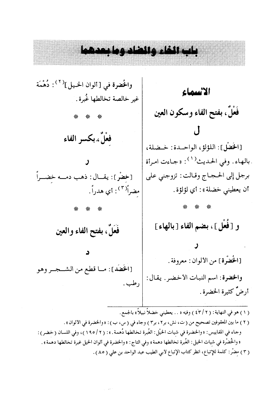 (2) ما بين المعقوفين تصحيح من (ت، نش، بر 2، بر 3) وجاء في (س، ب): «والخضرة في الألوان».