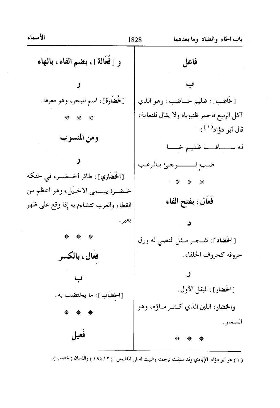 [خَاضب]: ظليم خاضب: وهو الذي أكل الربيع فاحمر ظنبوباه ولا يقال للنعامة، قال أبو دؤاد «1»: