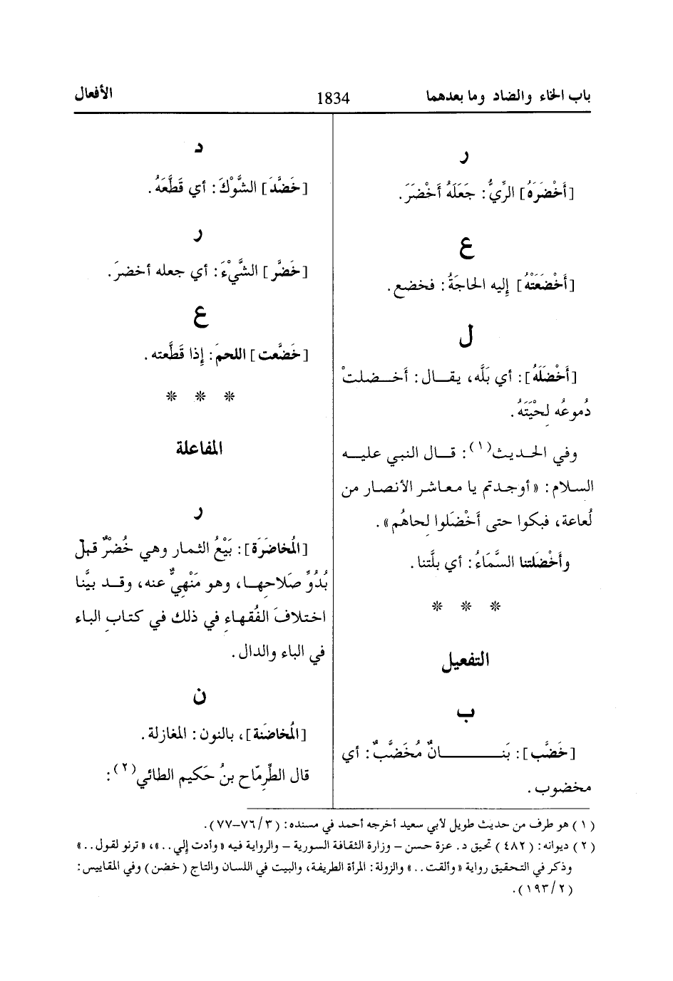 (2) ديوانه: (482) تحيق د. عزة حسن- وزارة الثقافة السورية- والرواية فيه «وأدت إِلي .. »، «ترنو لقول .. » وذكر في التحقيق رواية «وألقت .. » والزولة: المرأة الطريفة، والبيت في اللسان والتاج (خضن) وفي المقاييس: