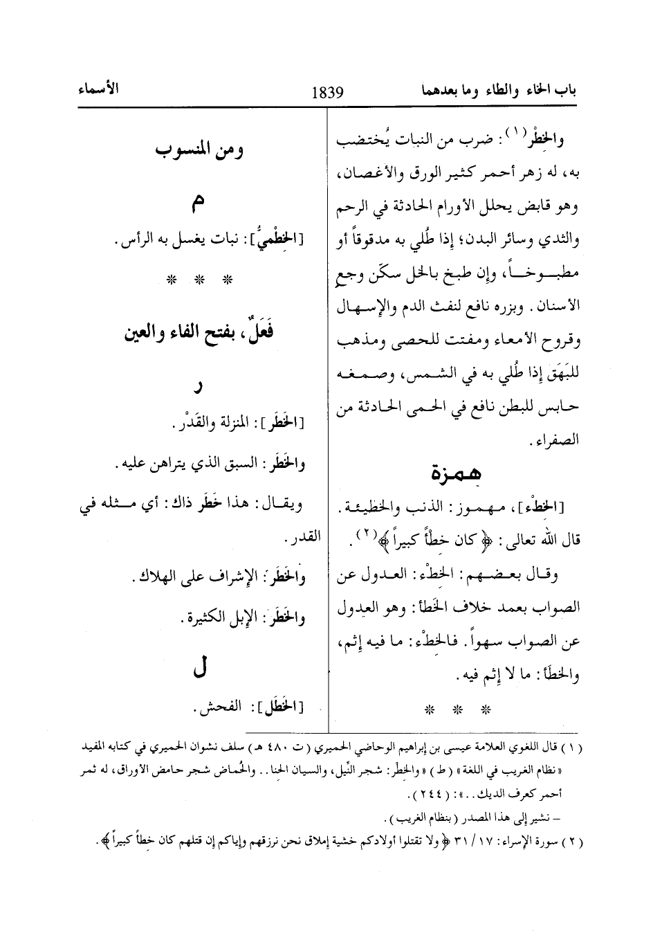 (1) قال اللغوي العلامة عيسى بن إِبراهيم الوحاضي الحميري (ت 480 هـ) سلف نشوان الحميري في كتابه المفيد «نظام الغريب في اللغة» (ط) «والخِطْر: شجر النِّيل، والسيان الحِنا .. والحُماض شجر حامض الأوراق، له ثمر أحمر كعرف الديك .. »: (244).