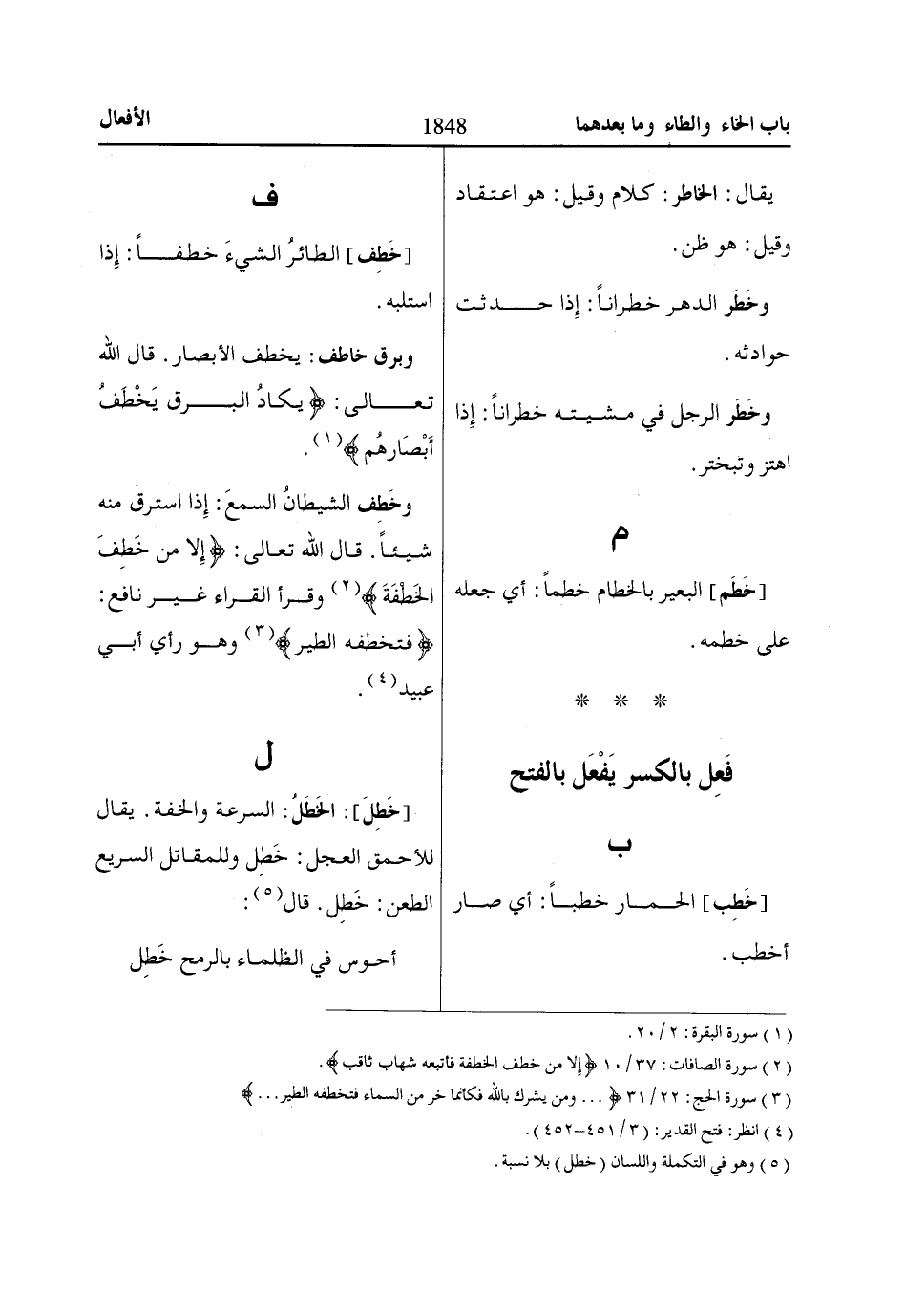 وبرق خاطف: يخطف الأبصار. قال الله تعالى: يَكاادُ الْبَرْقُ يَخْطَفُ أَبْصاارَهُمْ «1».