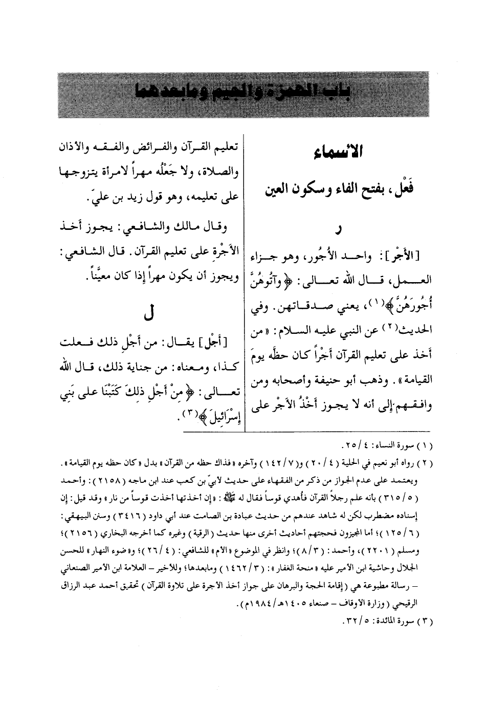 (6/ 125)؛ أما المجيزون فحجتهم أحاديث أخرى منها حديث (الرقية) وغيره كما أخرجه البخاري (2156)؛ ومسلم (2201)، وأحمد: (3/ 8)؛ وانظر في الموضوع «الأم» للشافعي: (4/ 26)؛ و «ضوء النهار» للحسن الجلال وحاشية ابن الأمير عليه «منحة الغفار»: (3/ 1462) وما بعدها؛ وللأخير- العلامة ابن الأمير الصنعاني- رسالة مطبوعة هي (إِقامة الحجة والبرهان على جواز أخذ الأجرة على تلاوة القرآن) تحقيق أحمد عبد الرزاق الرقيحي (وزارة الأوقاف- صنعاء 1405 هـ/ 1984 م).
