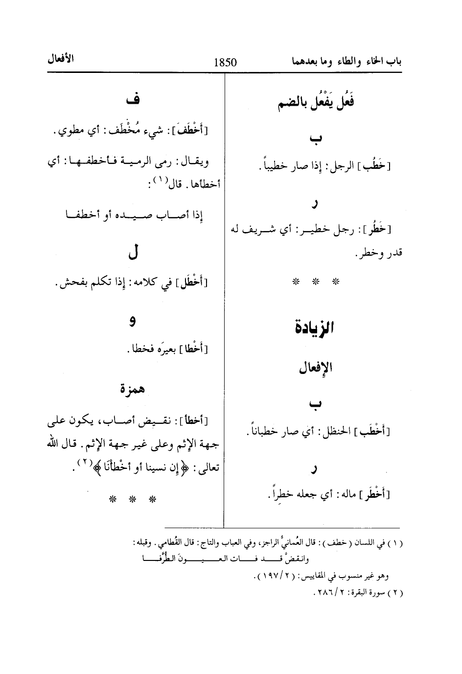 [أخطأ]: نقيض أصاب، يكون على جهة الإِثم وعلى غير جهة الإِثم. قال الله تعالى: إِنْ نَسِيناا أَوْ أَخْطَأْناا «2».