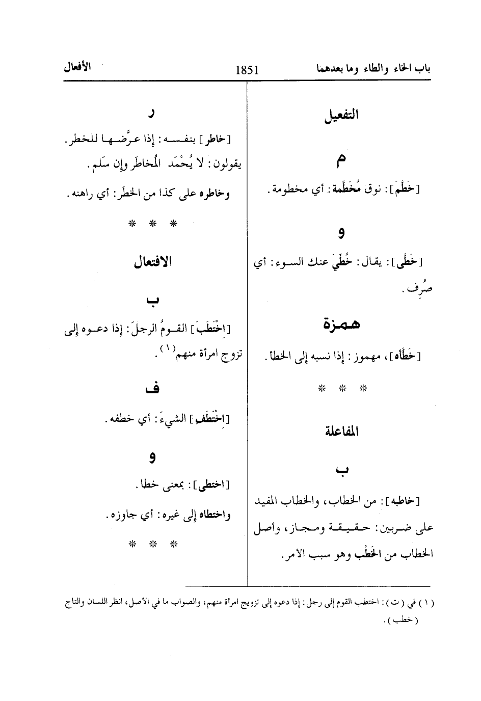 (1) في (ت): اختطب القوم إِلى رجل: إِذا دعوه إِلى تزويج امرأة منهم، والصواب ما في الأصل، انظر اللسان والتاج (خطب).