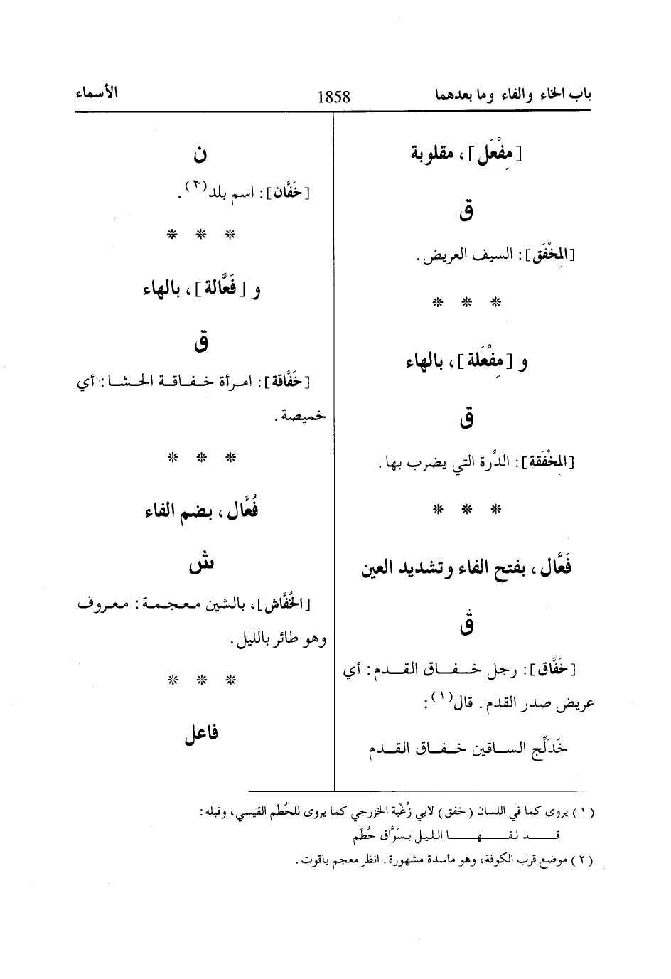 [خَفَّاق]: رجل خفاق القدم: أي عريض صدر القدم. قال «1»: