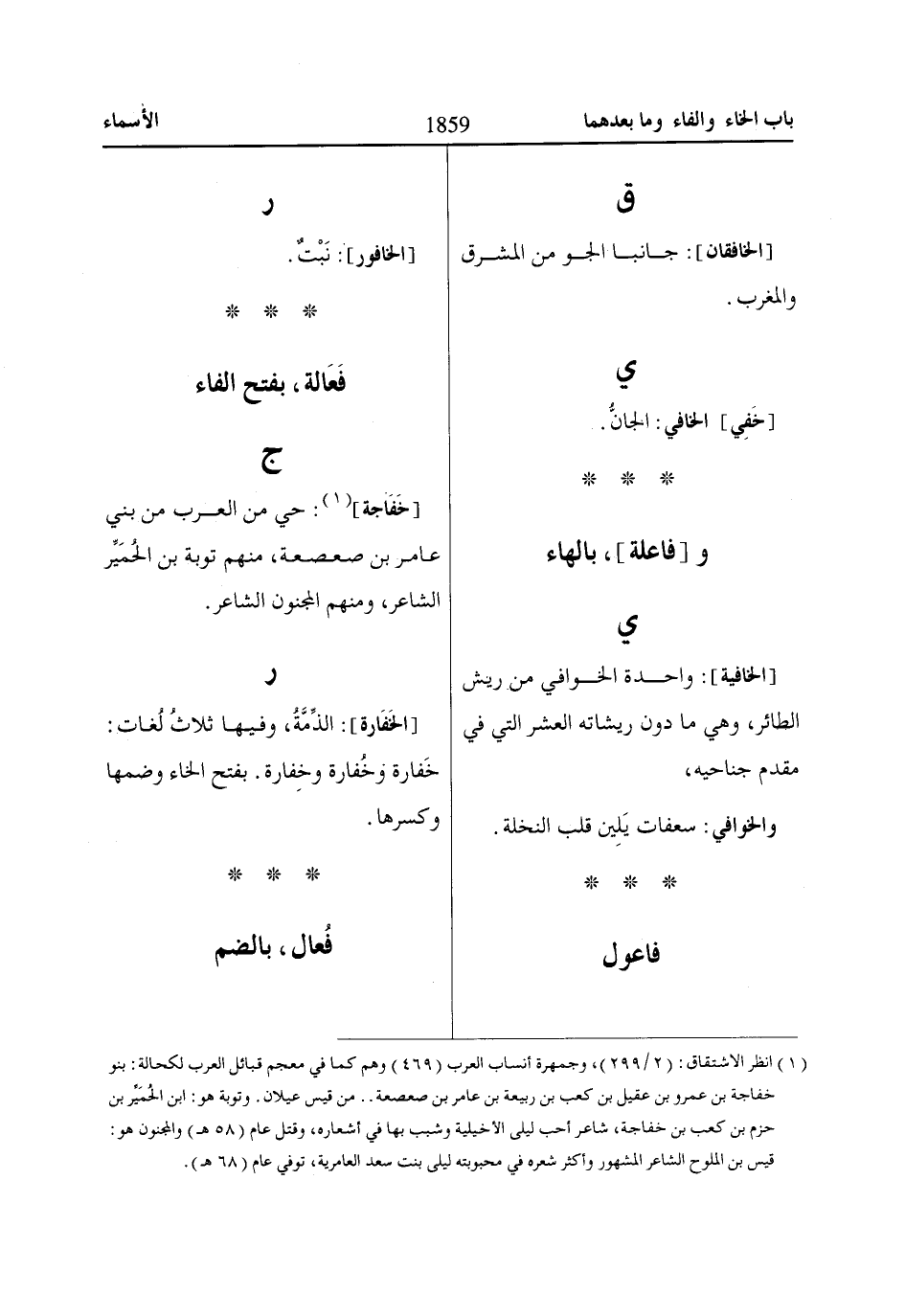 (1) انظر الاشتقاق: (2/ 299)، وجمهرة أنساب العرب (469) وهم كما في معجم قبائل العرب لكحالة: بنو خفاجة بن عمرو بن عقيل بن كعب بن ربيعة بن عامر بن صعصعة .. من قيس عيلان. وتوبة هو: ابن الحُمَيِّر بن حزم بن كعب بن خفاجة، شاعر أحب ليلى الأخيلية وشبب بها في أشعاره، وقتل عام (58 هـ) والمجنون هو: