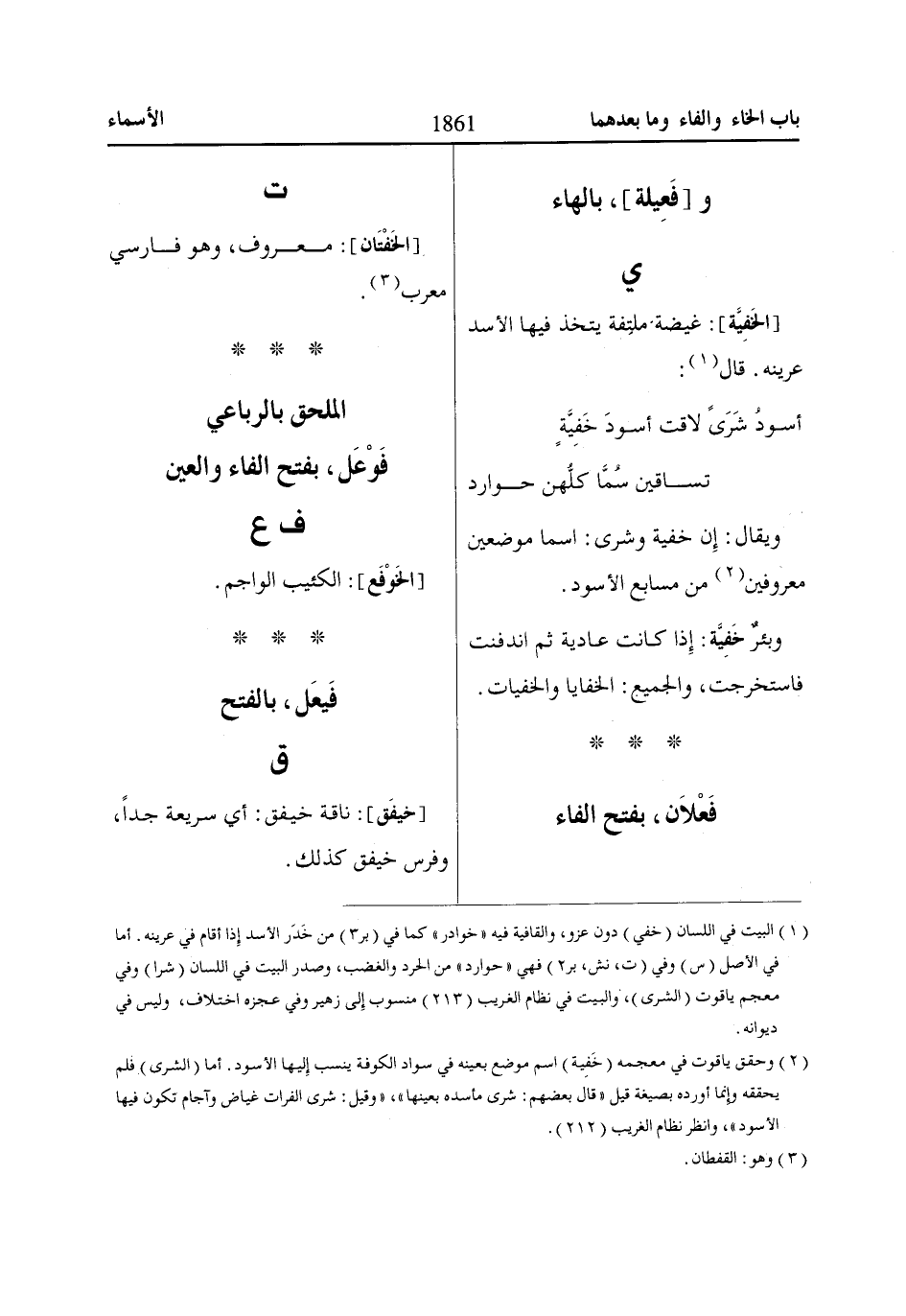 (2) وحقق ياقوت في معجمه (خَفِية) اسم موضع بعينه في سواد الكوفة ينسب إِليها الأسود. أما (الشرى) فلم يحققه وإِنما أورده بصيغة قيل «قال بعضهم: شرى مأسده بعينها»، «وقيل: شرى الفرات غياض وآجام تكون فيها الأسود»، وانظر نظام الغريب (212).