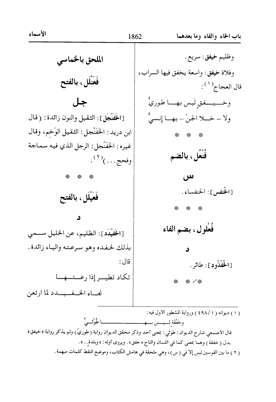 [الخَفَنْجَل]: الثقيل والنون زائدة: (قال ابن دريد: الخَفَنْجل: الثقيل الوَخِم، وقال غيره: الخَفَنْجل: الرجل الذي فيه سماجة وفحج ... ) «2».