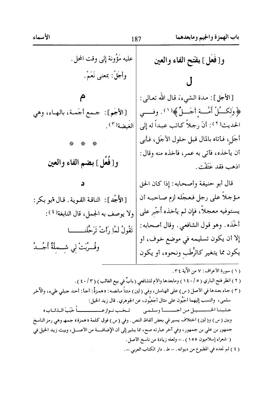 (3) جاء بعدها في الأصل (س) على الهامش، وفي (لين) متناً ما نصه: «همزةٌ: أجأ: أحد جبلي طيء، والآخر سلمى، والنسب إِليهما أجَيُّون على مثال أَجَغِيُّون، عن الجوهري. قال زيد الخيل: