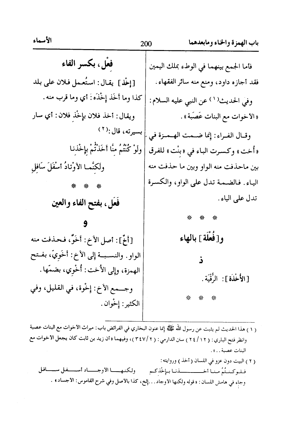 و [أَخٌ]: أصل الأَخ: أَخَوٌ، فحذفت منه الواو. والنسبة إِلى الأَخ: أَخَوِيّ، بفتح الهمزة، وإِلى الأُخت: أُخْوِي، بضمّها.