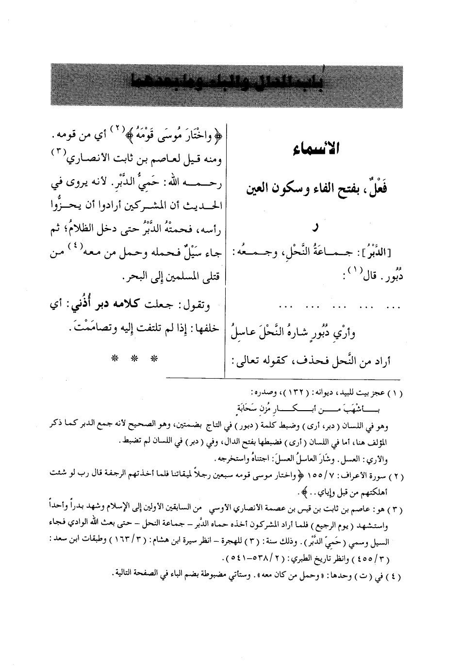 وهو في اللسان (دبر، أرى) وضبط كلمة (دبور) في التاج بضمتين، وهو الصحيح لأنه جمع الدبر كما ذكر المؤلف هنا، أما في اللسان (أرى) فضبطها بفتح الدال، وفي (دبر) في اللسان لم تضبط.