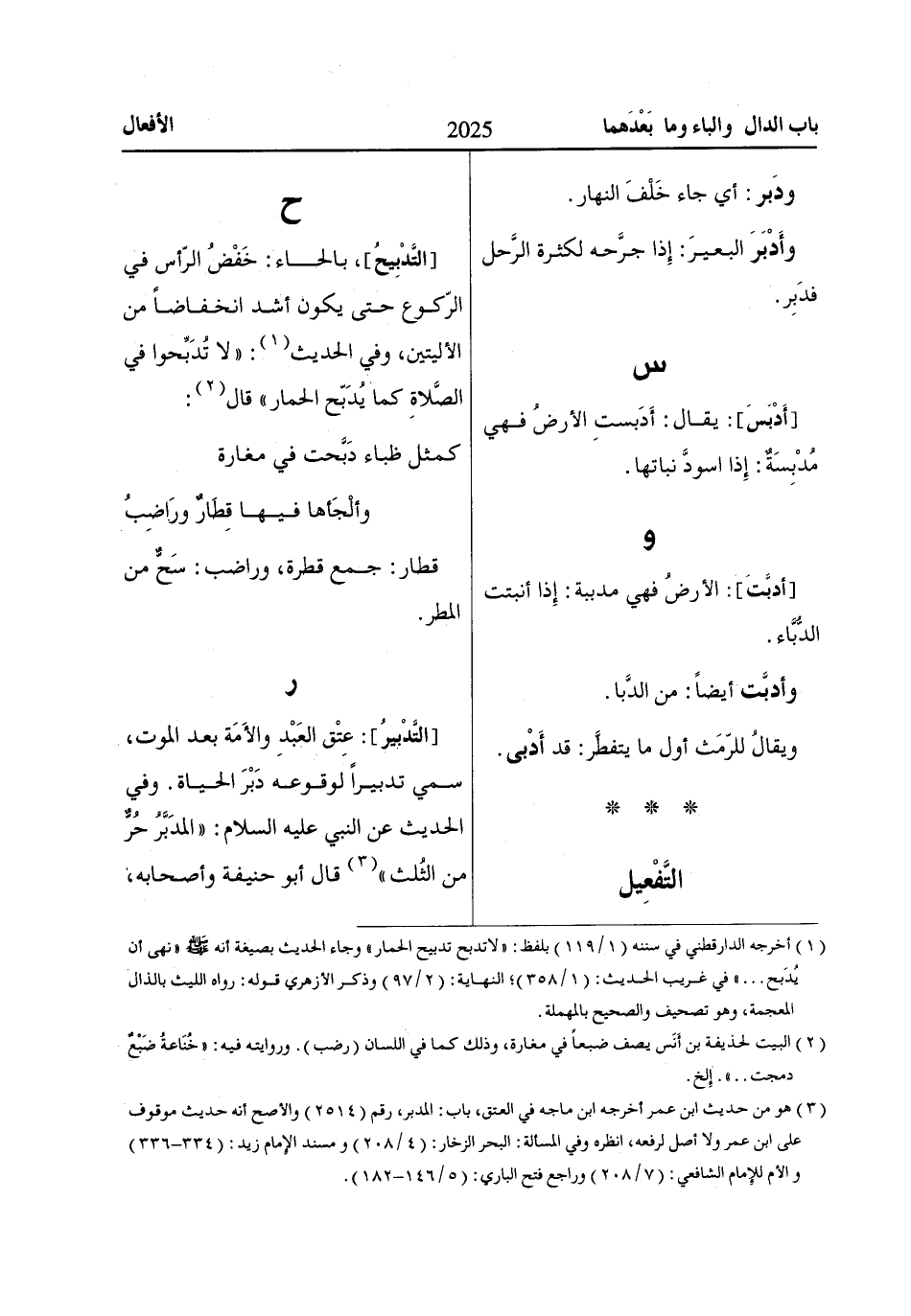 (1) أخرجه الدارقطني في سننه (1/ 119) بلفظ: «لا تدبح تدبيح الحمار» وجاء الحديث بصيغة أنه صلّى الله عليه وسلم «نهى أن يُدَبح ... » في غريب الحديث: (1/ 358)؛ النهاية: (2/ 97) وذكر الأزهري قوله: رواه الليث بالذال المعجمة، وهو تصحيف والصحيح بالمهملة.