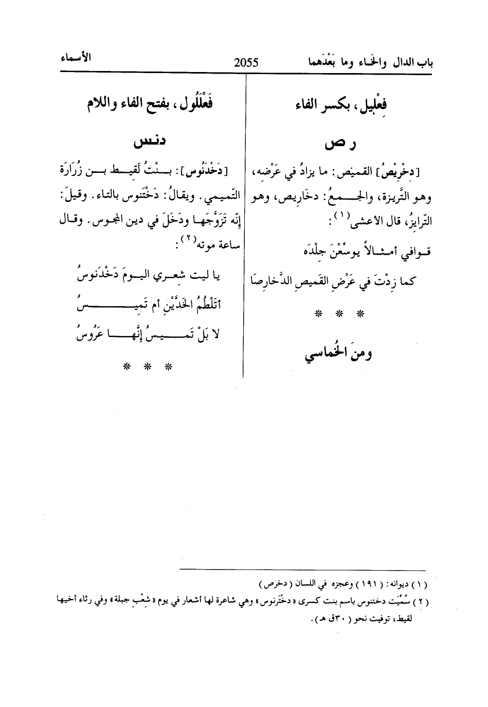 (2) سُمِّيَت دختنوس باسم بنت كسرى «دخترنوس» وهي شاعرة لها أشعار في يوم «شِعْبِ جبلة» وفي رثاء أخيها لقيط، توفيت نحو (30 ق هـ).