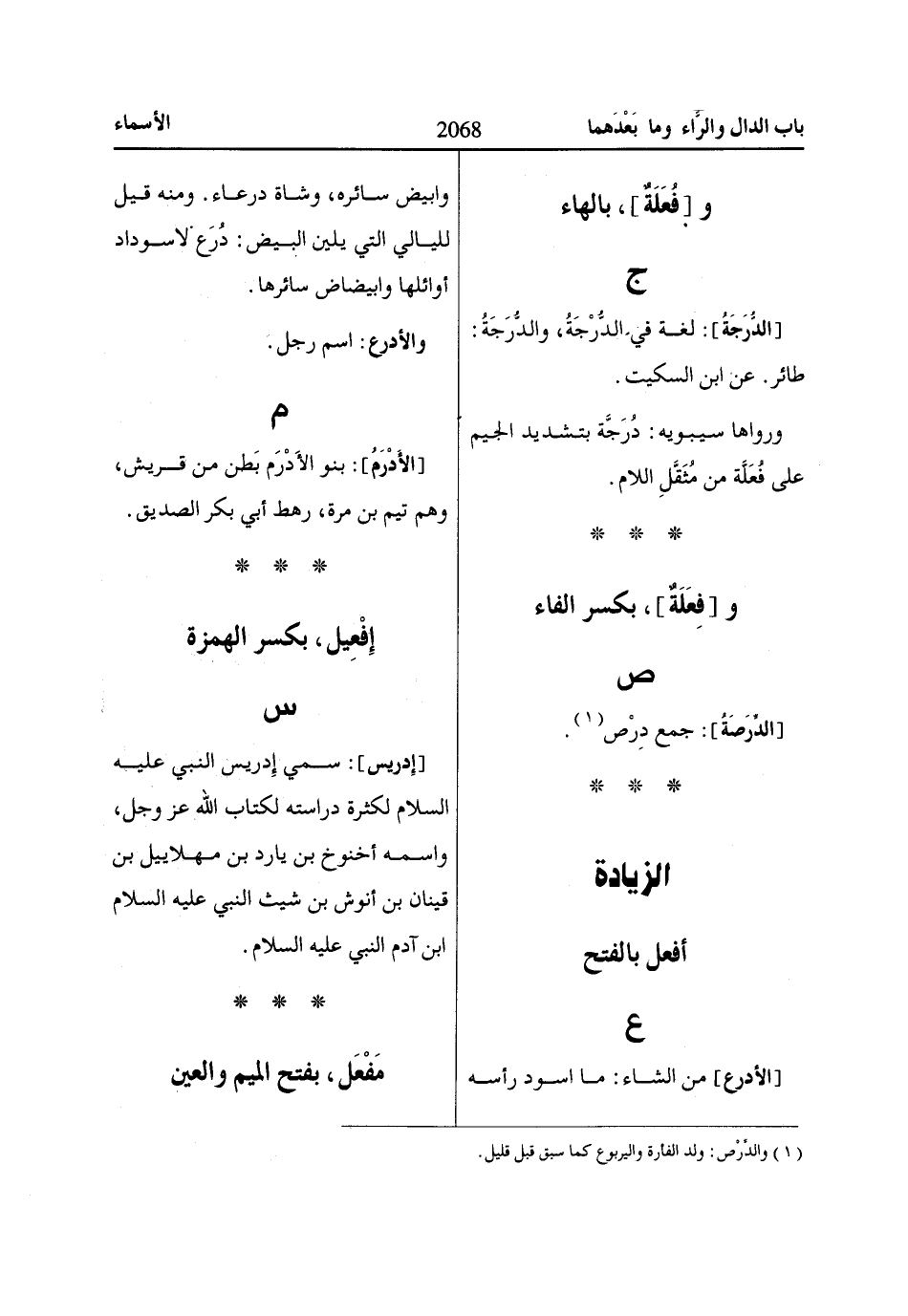 [إِدريس]: سمي إِدريس النبي عليه السلام لكثرة دراسته لكتاب الله عز وجل، واسمه أخنوخ بن يارد بن مهلاييل بن قينان بن أنوش بن شيث النبي عليه السلام ابن آدم النبي عليه السلام.