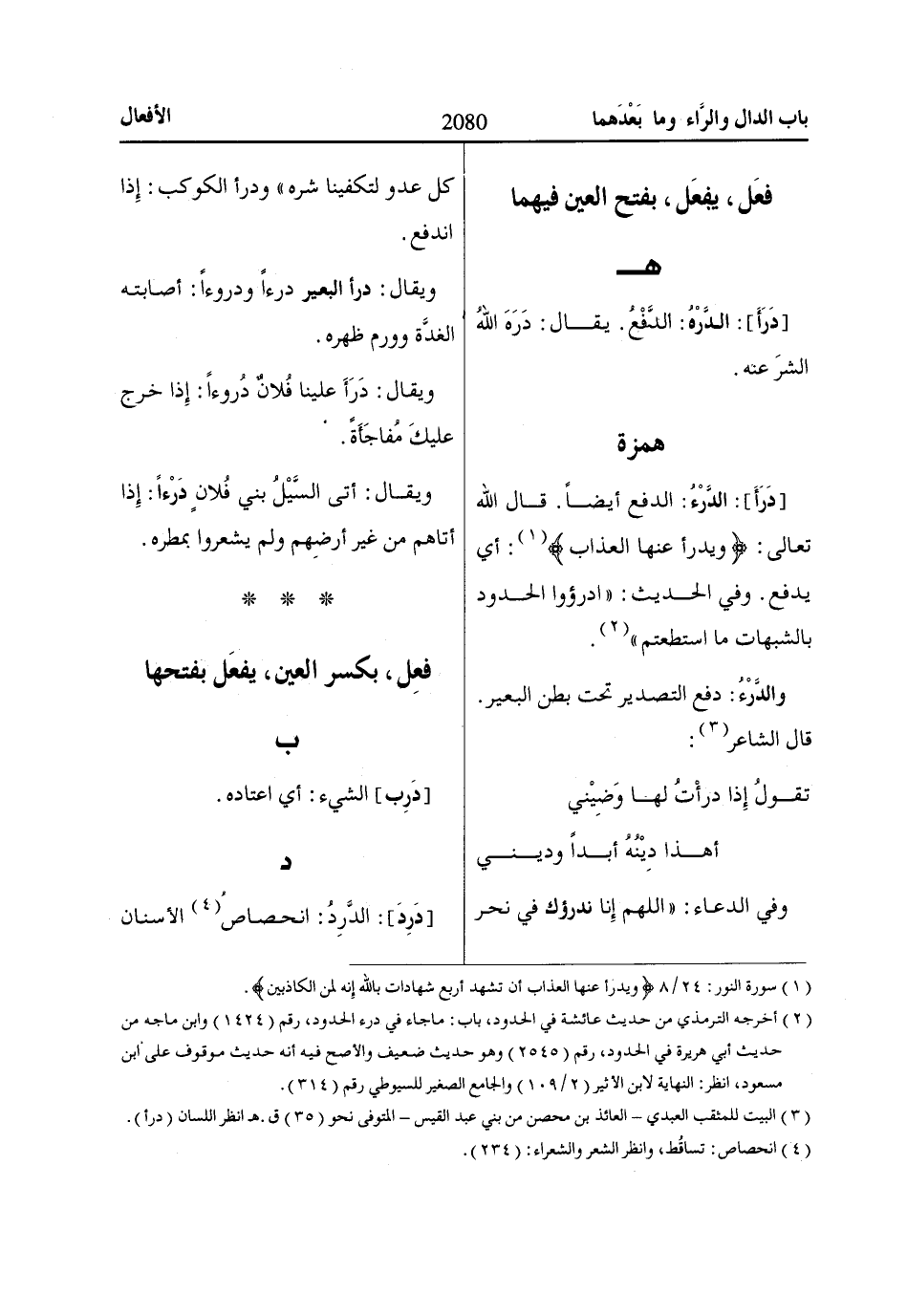 [دَرَأَ]: الدَّرْءُ: الدفع أيضاً. قال الله تعالى: وَيَدْرَؤُا عَنْهَا الْعَذاابَ «1»: أي يدفع.