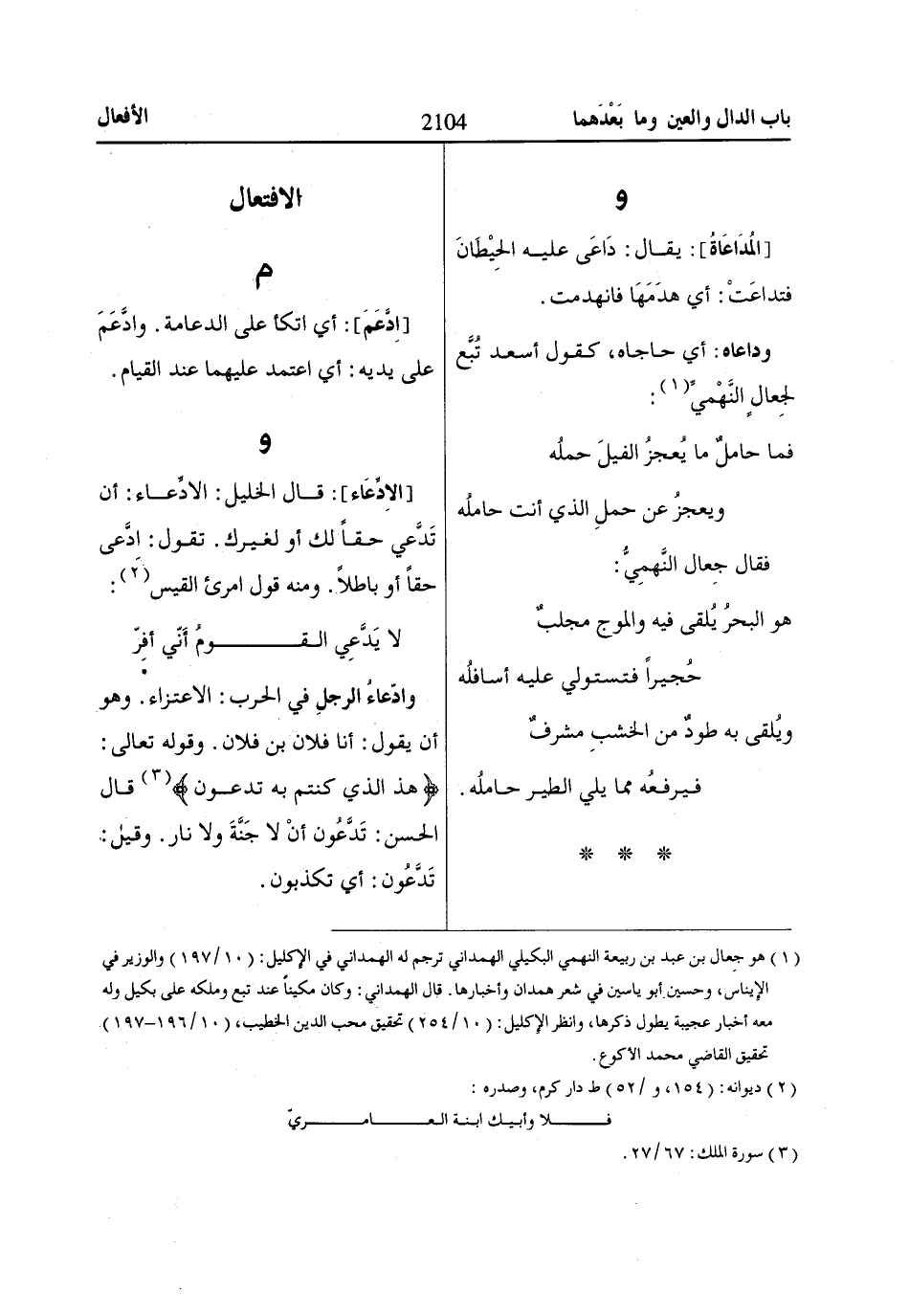 و [الادِّعَاء]: قال الخليل: الادِّعاء: أن تَدَّعي حقاً لك أو لغيرك. تقول: ادَّعى حقاً أو باطلًا. ومنه قول امرئ القيس «2»: