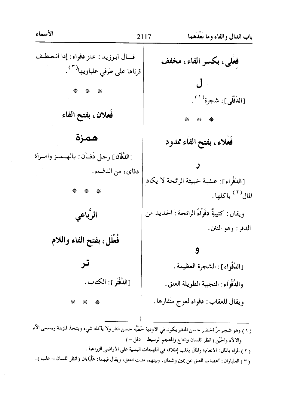 (1) وهو شجر مرّ أخضر حسن المنظر يكون في الأودية حَطَبُه حسن النار ولا يأكله شيء ويتخذ للزينة ويسمى الآء والألآء والحَبَن (انظر اللسان والتاج والمعجم الوسيط- دفل-)
