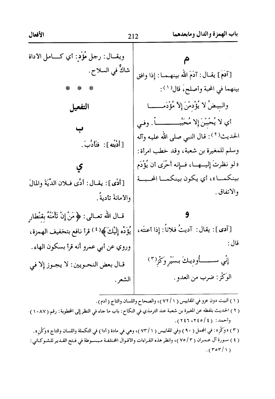 [آدَمَ] يقال: آدَمَ اللّاه بينهما: إِذا وافق بينهما في المحبة وأصلح، قال «1»: