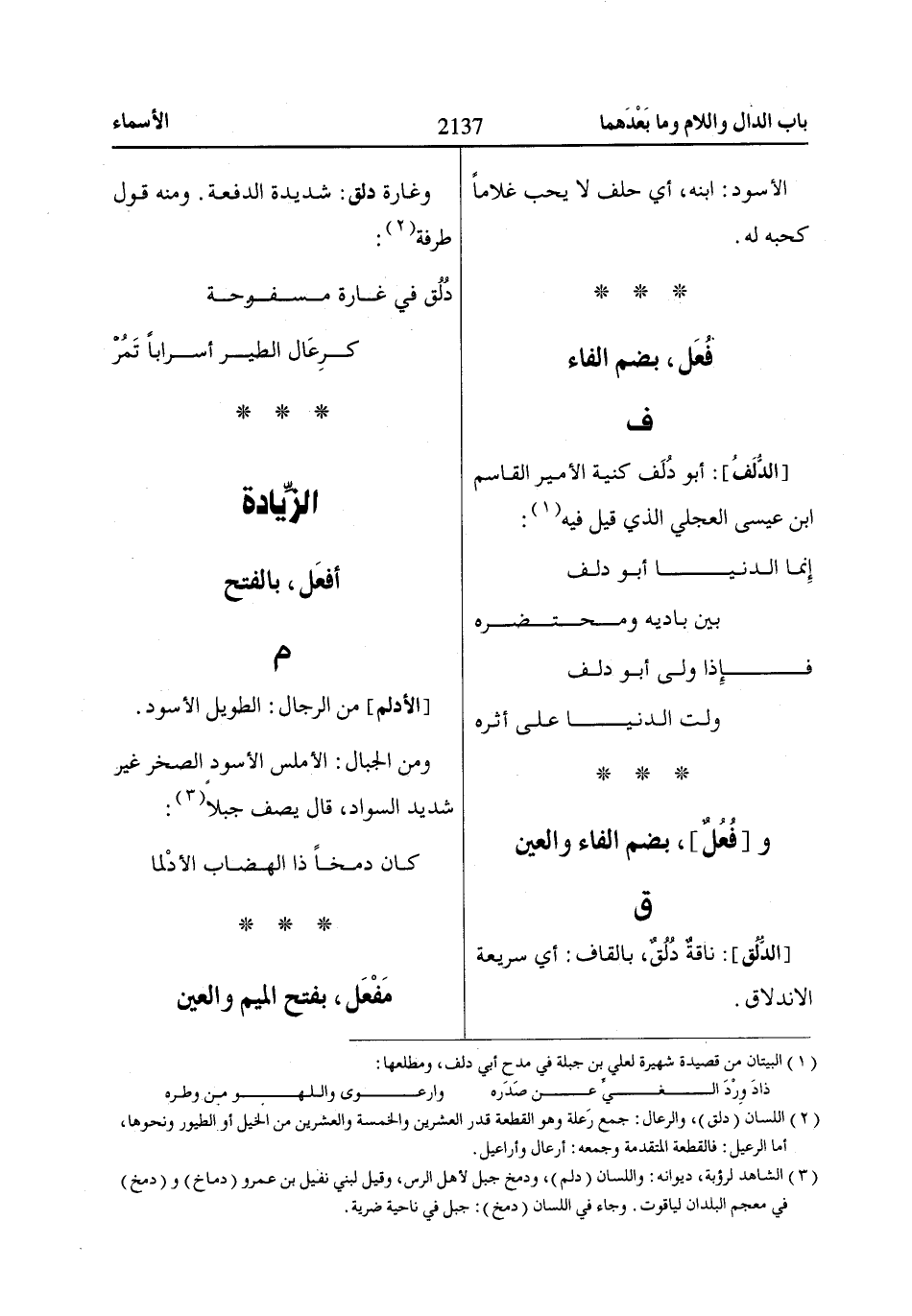 [الدُّلَفُ]: أبو دُلَف كنية الأمير القاسم ابن عيسى العجلي الذي قيل فيه «1»: