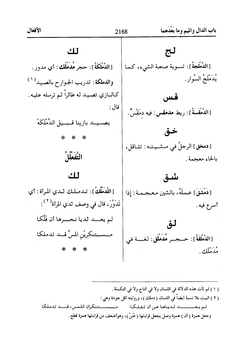 (2) البيت بلا نسبة أيضاً في اللسان (دملك)، وروايته أقل جودة وهي: