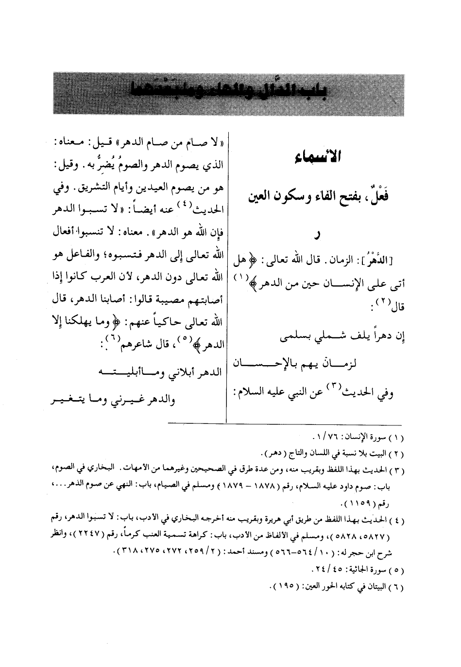 معناه: لا تنسبوا أفعال الله تعالى إِلى الدهر فتسبوه؛ والفاعل هو الله تعالى دون الدهر، لأن العرب كانوا إِذا أصابتهم مصيبة قالوا: أصابنا الدهر، قال الله تعالى حاكياً عنهم: وَماا يُهْلِكُناا إِلَّا الدَّهْرُ «5»، قال شاعرهم «6»: