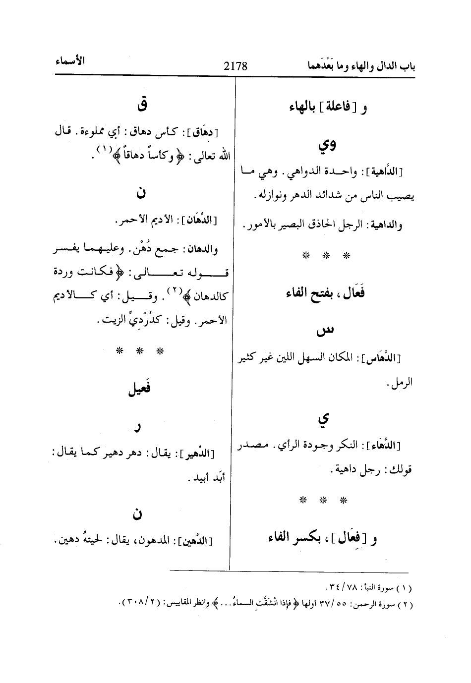[دِهَاق]: كأس دهاق: أي مملوءة. قال الله تعالى: وَكَأْساً دِهااقاً «1».