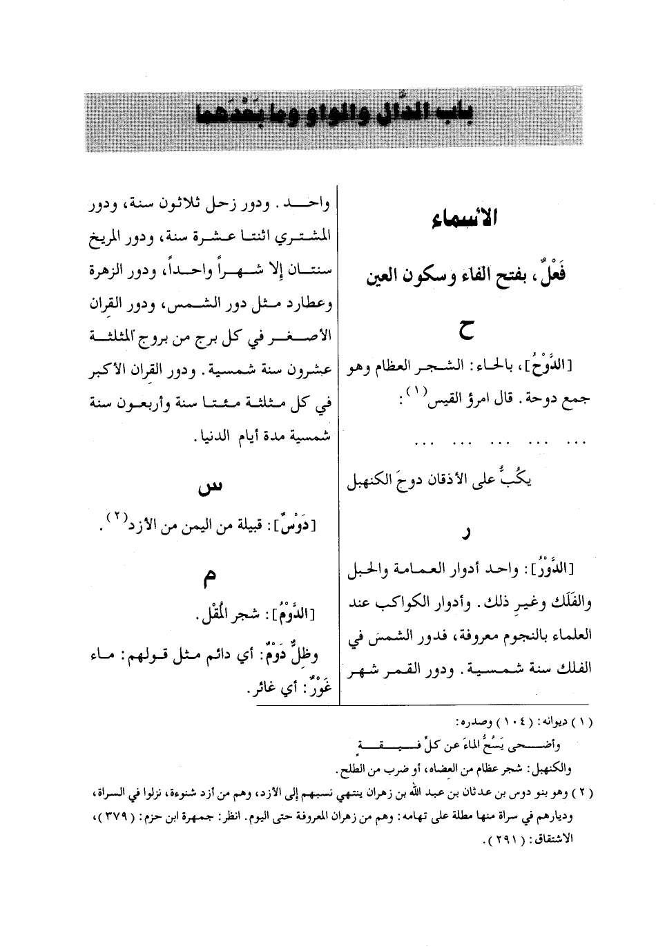 [الدَّوْرُ]: واحد أدوار العمامة والحبل والفَلَك وغيرِ ذلك. وأدوار الكواكب عند العلماء بالنجوم معروفة، فدور الشمس في الفلك سنة شمسية. ودور القمر شهر واحد. ودور زحل ثلاثون سنة، ودور المشتري اثنتا عشرة سنة، ودور المريخ سنتان إِلا شهراً واحداً، ودور الزهرة وعطارد مثل دور الشمس، ودور القِران الأصغر في كل برج من بروج المثلثة عشرون سنة شمسية. ودور القِران الأكبر في كل مثلثة مئتا سنة وأربعون سنة شمسية مدة أيام الدنيا.
