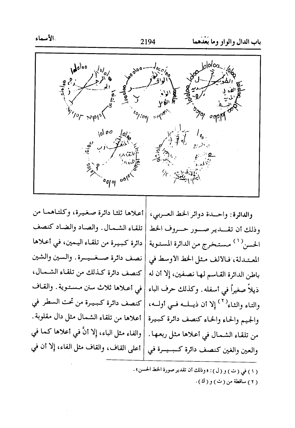 والدائرة: واحدة دوائر الخط العربي، وذلك أن تقدير صور حروف الخط الحسن «1» مستخرج من الدائرة المستوية المعتدلة، فالألف مثل الخط الأوسط في باطن الدائرة القاسم لها نصفين، إِلا أن له ذيلًا صغيراً في أسفله. وكذلك حرف الباء والتاء والثاء «2» إِلا أن ذيله في أوله، والجيم والحاء والخاء كنصف دائرة كبيرة من تلقاء الشمال في أعلاها مثل ربعها.