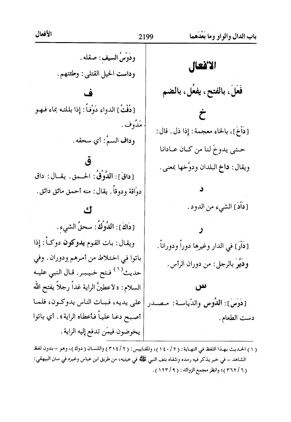 (1) الحديث بهذا اللفظ في النهاية: (2/ 140)، والمقاييس: (2/ 314) واللسان (دوك)، وهو- بدون لفظ الشاهد- في خبر يذكر فيه رمده وشفاه بتف النبي صلّى الله عليه وسلم في عينيه، من طريق ابن عباس وغيره في سنن البيهقي: