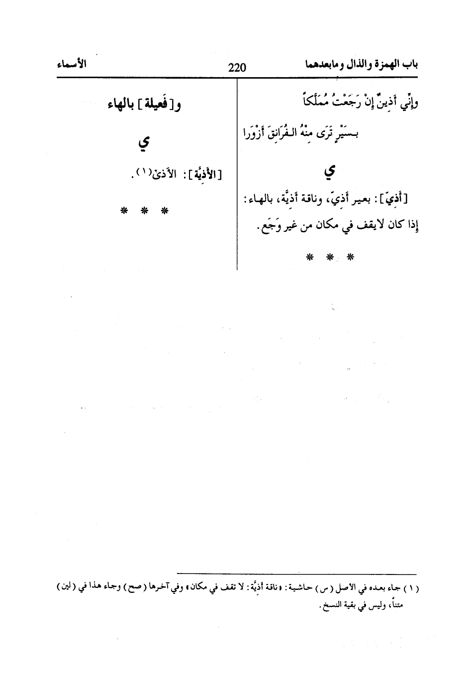 (1) جاء بعده في الأصل (س) حاشية: «ناقة أَذِيَّة: لا تقف في مكان» وفي آخرها (صح) وجاء هذا في (لين) متناً، وليس في بقية النسخ.