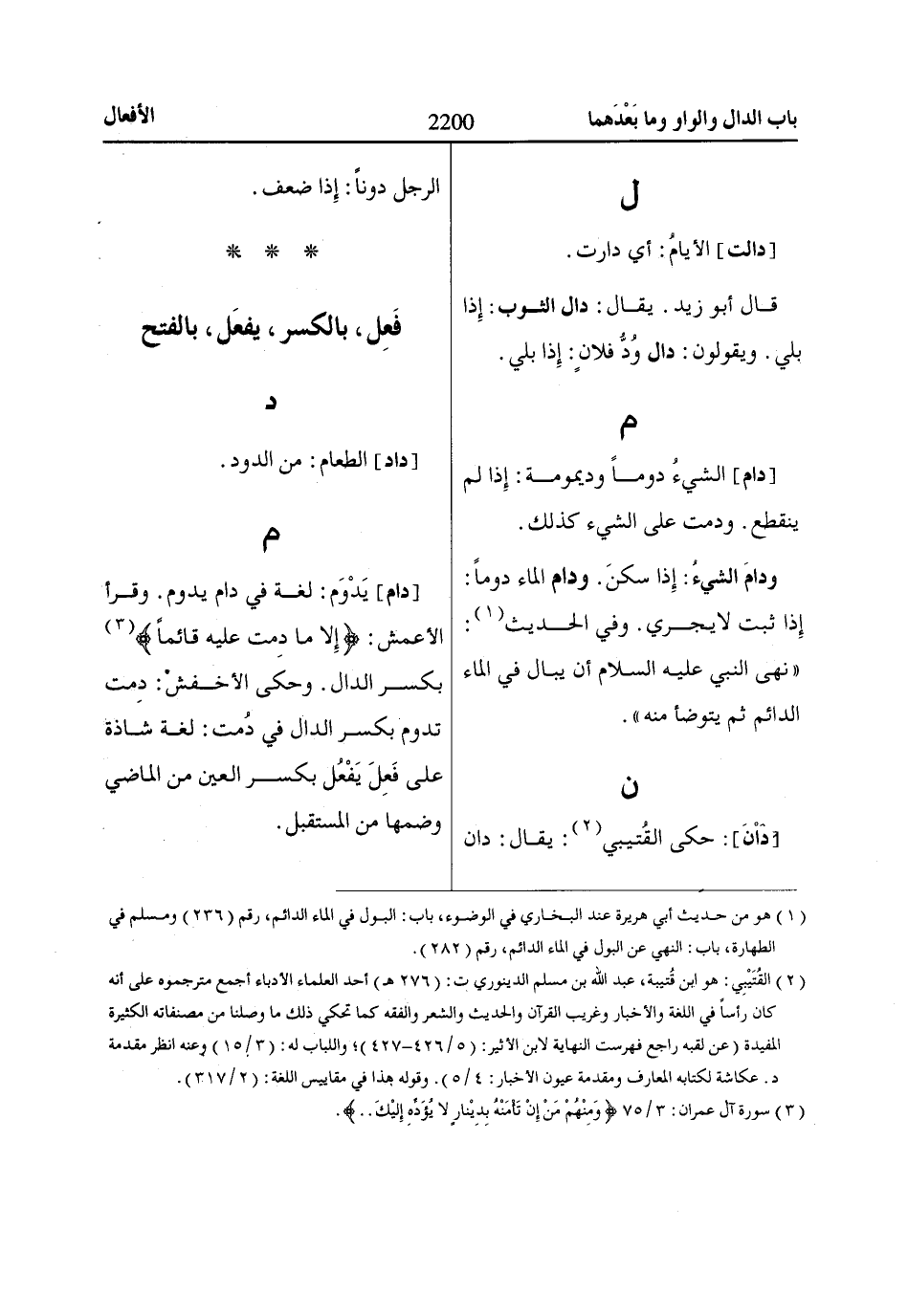 [دام] يَدْوَم: لغة في دام يدوم. وقرأ الأعمش: إِلَّا مَا دِمْتَ عَلَيْهِ قَائِماً «3» بكسر الدال. وحكى الأخفش: دِمت تدوم بكسر الدال في دُمت: لغة شاذة على فَعِلَ يَفْعُل بكسر العين من الماضي وضمها من المستقبل.