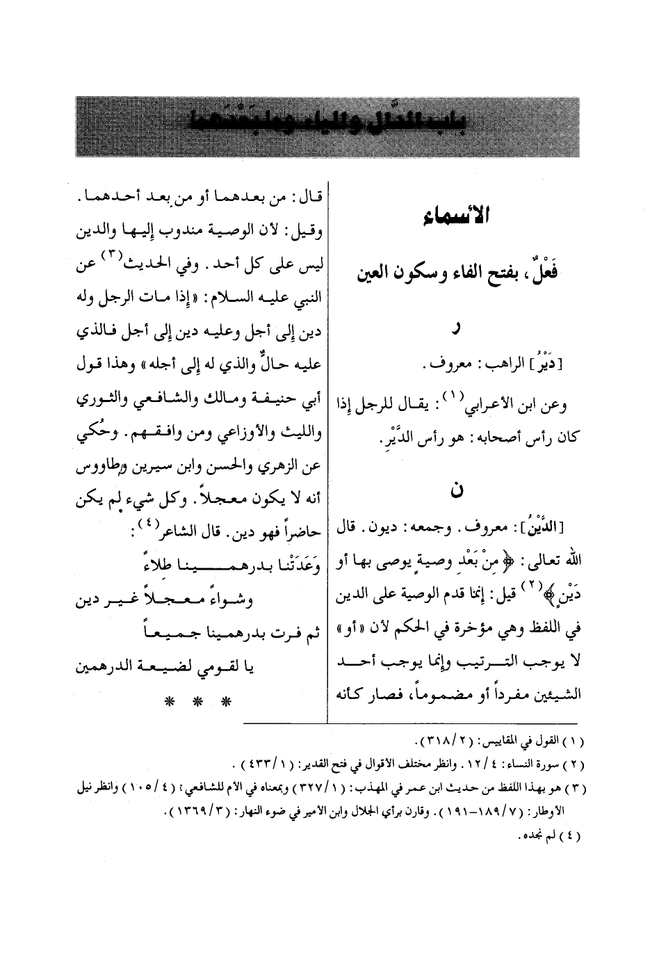 [الدَّيْنُ]: معروف. وجمعه: ديون. قال الله تعالى: مِنْ بَعْدِ وَصِيَّةٍ يُوصِي بِهاا أَوْ دَيْنٍ* «2» قيل: إِنما قدم الوصية على الدين في اللفظ وهي مؤخرة في الحكم لأن «أو» لا يوجب الترتيب وإِنما يوجب أحد الشيئين مفرداً أو مضموماً، فصار كأنه قال: من بعدهما أو من بعد أحدهما.