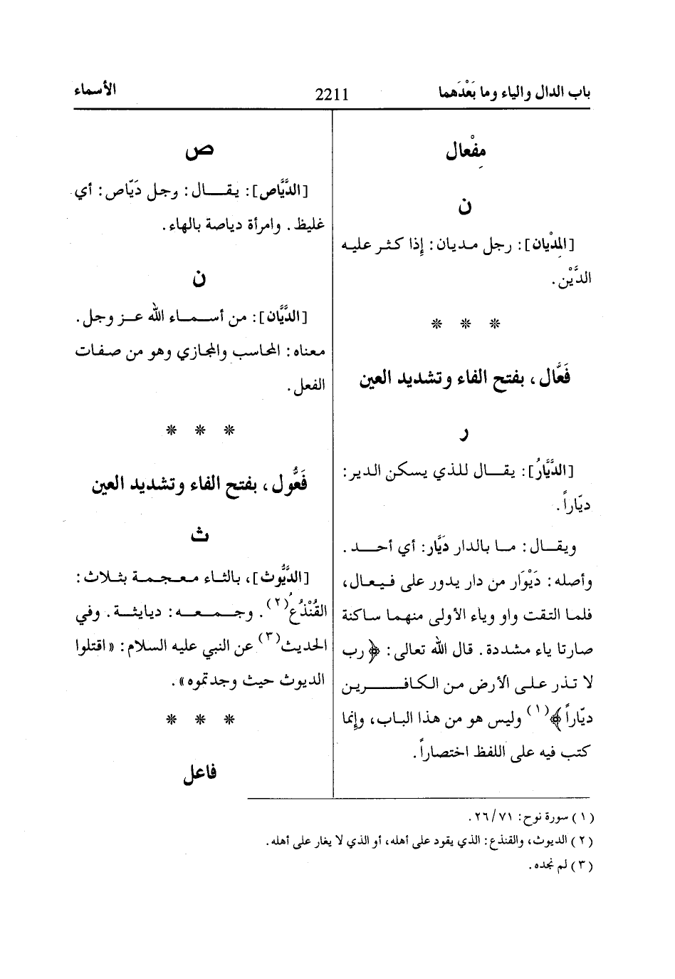 وأصله: دَيْوَار من دار يدور على فيعال، فلما التقت واو وياء الأولى منهما ساكنة صارتا ياء مشددة. قال الله تعالى: رَبِّ لاا تَذَرْ عَلَى الْأَرْضِ مِنَ الْكاافِرِينَ دَيّااراً «1» وليس هو من هذا الباب، وإِنما كتب فيه على اللفظ اختصاراً.