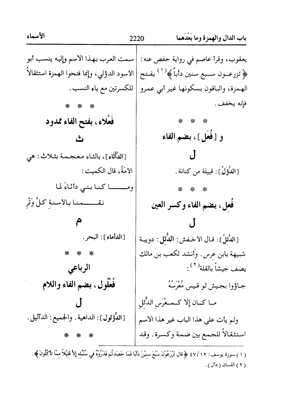 ولم يأت على هذا الباب غير هذا الاسم استثقالًا للجمع بين ضمة وكسرة. وقد سمت العرب بهذا الاسم وإِليه ينسب أبو الأسود الدؤلي، وإِنما فتحوا الهمزة استثقالًا للكسرتين مع ياء النسب.