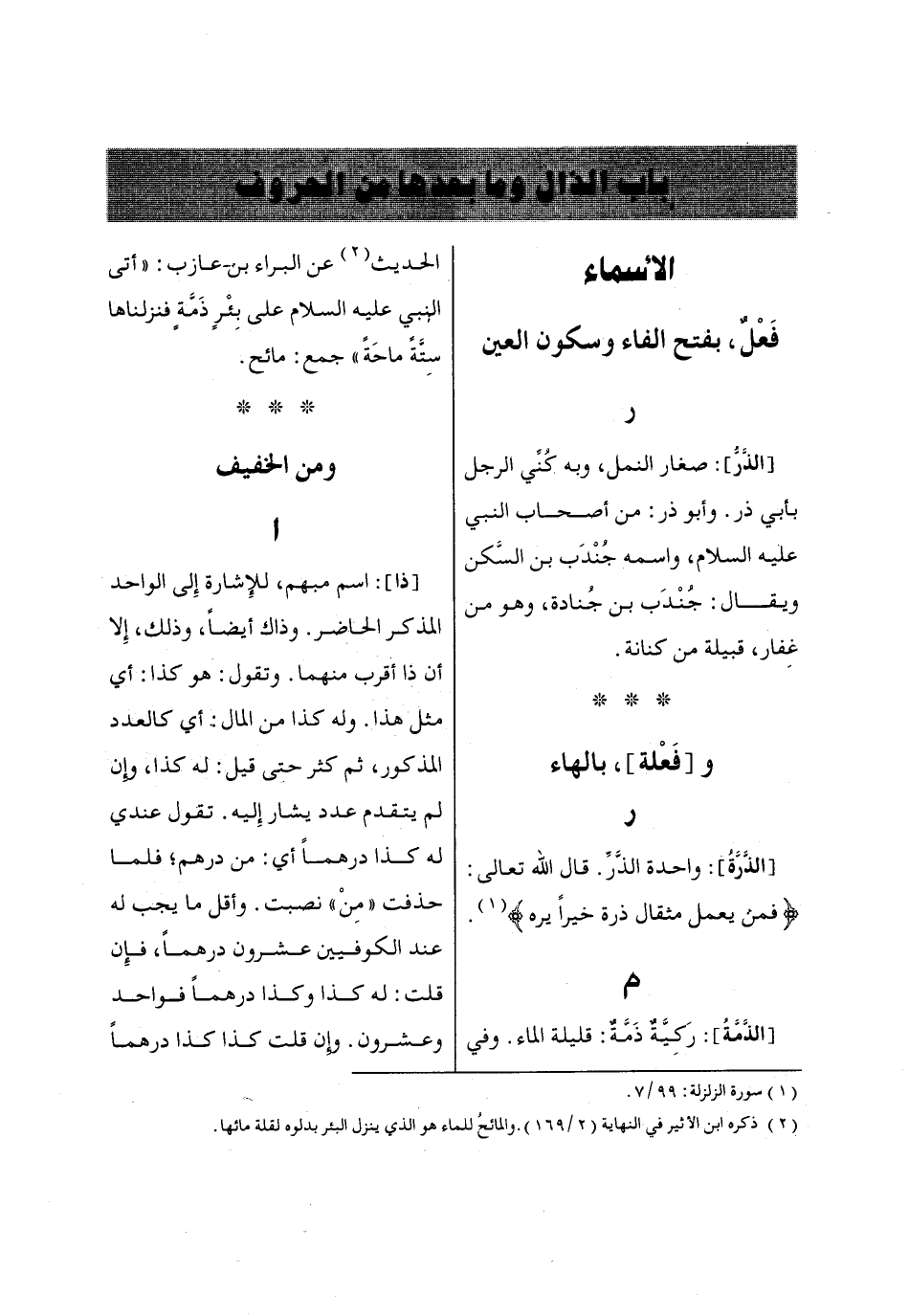 [الذَّرُّ]: صغار النمل، وبه كُنِّي الرجل بأبي ذر. وأبو ذر: من أصحاب النبي عليه السلام، واسمه جُنْدَب بن السَّكن ويقال: جُنْدَب بن جُنادة، وهو من غِفار، قبيلة من كنانة.