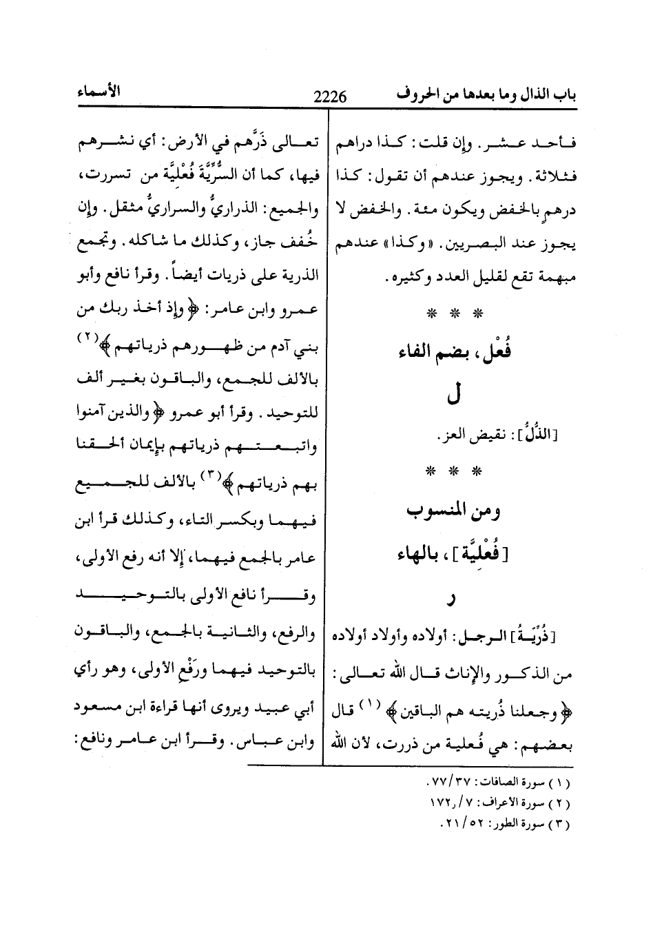 وَجَعَلْناا ذُرِّيَّتَهُ هُمُ الْبااقِينَ «1» قال بعضهم: هي فُعلية من ذررت، لأن الله تعالى ذَرَّهم في الأرض: أي نشرهم فيها، كما أن السُّرِّيَّةَ فُعْلِيَّة من تسررت، والجميع: الذراريُّ والسراريُّ مثقل. وإِن خُفف جاز، وكذلك ما شاكله. وتجمع الذرية على ذريات أيضاً. وقرأ نافع وأبو عمرو وابن عامر: وَإِذْ أَخَذَ رَبُّكَ مِنْ بَنِي آدَمَ مِنْ ظُهُورِهِمْ ذرياتهم «2» بالألف للجمع، والباقون بغير ألف للتوحيد. وقرأ أبو عمرو والذين آمنوا واتبعتهم ذرياتهم بإيمان ألحقنا بهم ذرياتهم «3» بالألف للجميع فيهما وبكسر التاء، وكذلك قرأ ابن عامر بالجمع فيهما، إِلا أنه رفع الأولى، وقرأ نافع الأولى بالتوحيد والرفع، والثانية بالجمع، والباقون بالتوحيد فيهما ورَفْعِ الأولى، وهو رأي أبي عبيد ويروى أنها قراءة ابن مسعود وابن عباس. وقرأ ابن عامر ونافع: