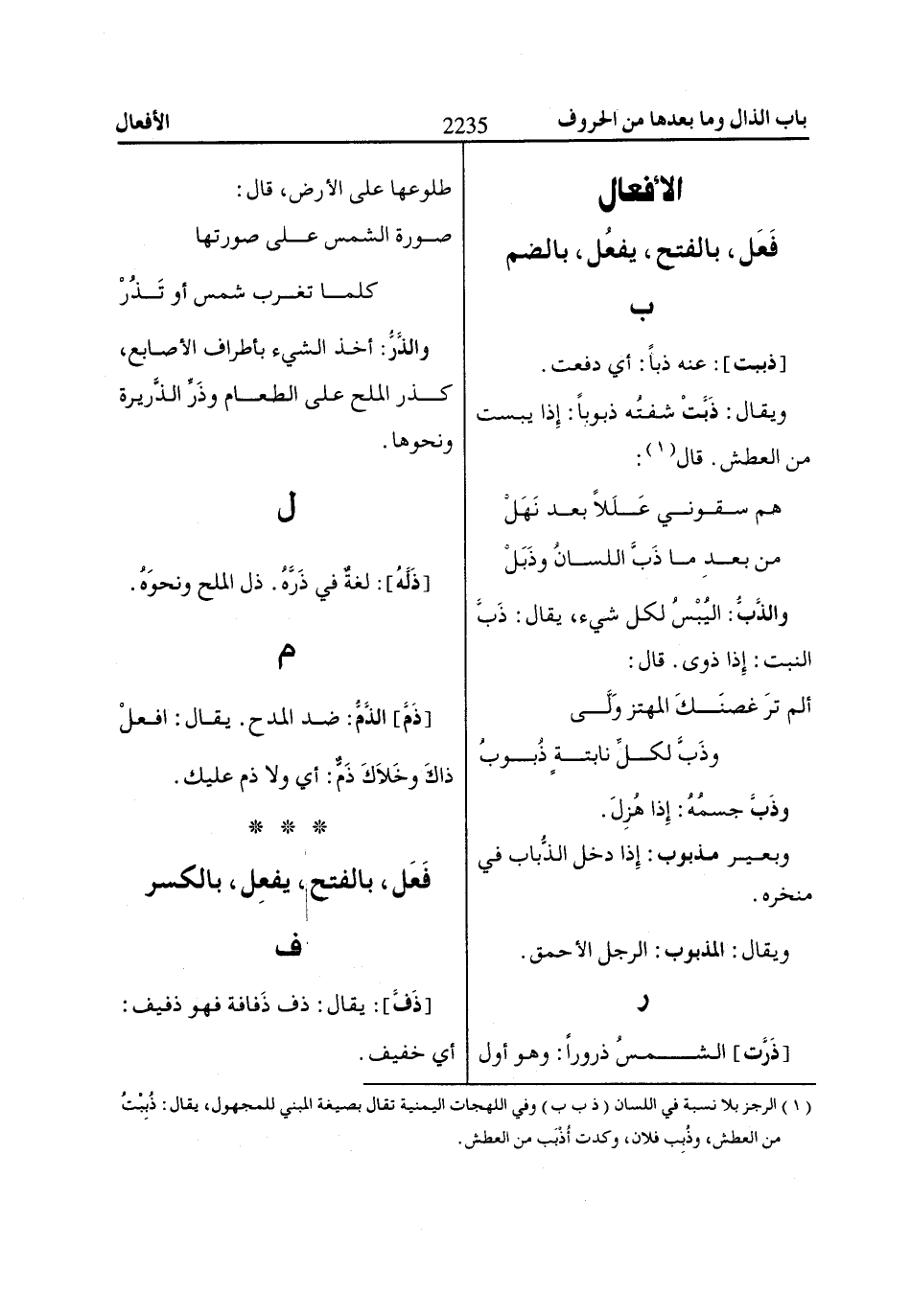 (1) الرجز بلا نسبة في اللسان (ذ ب ب) وفي اللهجات اليمنية تقال بصيغة المبني للمجهول، يقال: ذُبِبْتُ من العطش، وذُبِب فلان، وكدت أُذْبَب من العطش.