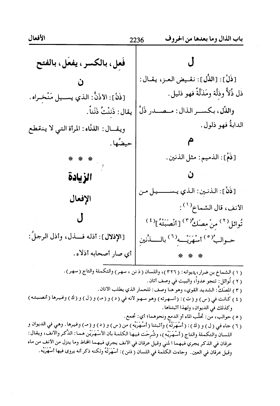 عرقان في الذكر يجري فيهما المني وقيل عرفان في الأنف يجري فيهما المخاط وما ينزل من الأنف من ماء وقيل عرقان في العين. وجاءت الكلمة في اللسان (ذنن): أَسْهَرَتْهُ ولكنه ذكر أنه يروى فيها أسْهَرَيْه.